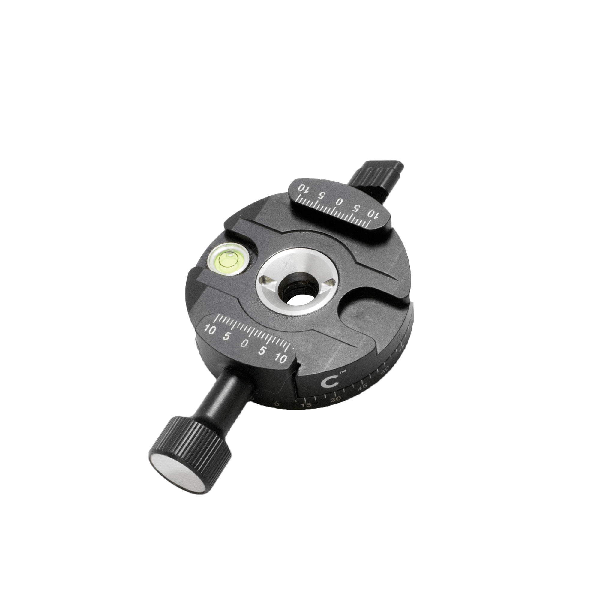 A durable and functional design, the Cinegears Precision Panning Head with Single Bubble Level is CNC machine cut from aircraft-grade aluminum and has several key features. The panning head allows you to quickly drop the panning clamp onto your current clamp to make panoramic shooting quick and accurate; precision panning movement with increments of 2.5 degrees. Includes a safety stop relief groove to protect your camera from accidental drops, and friction adjustment (with a built in lock) to give you full control of panning and balance.